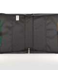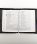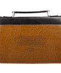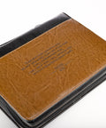 The top black panel wraps around the spine and onto the back panel, where a saddle-tan brown pocket is adhered and heat-debossed with a Scripture verse.