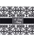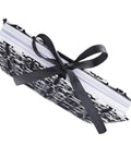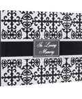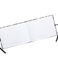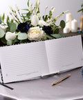 The black silken spine of the guest book is equipped with a black elastic pen loop, ensuring a writing instrument is always within reach. The covers are closed with two black satin ribbons that are tied in a bow.