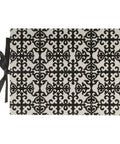 The cover has a silver background that is trimmed with a black velvet flocked design. At its center, a black faux leather patch is appliquéd. The patch bears the title in silver scripted letters.