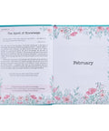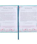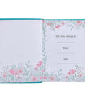 The 392 pages are gilt-edged in coordinating silver for added elegance. The interior pages are decorated with a full-color floral motive in shades of soft pink and green that complements the design on the cover. A teal silk ribbon marker is included to mark your place.