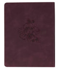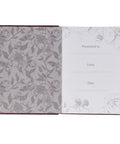 The maroon faux leather cover features an elegant, heat-debossed diamond-shaped frame encircled by intricate heat-debossed flowers. Adding another layer of elegance, delicate gold-foiled floral outlines shimmer among their heat-debossed counterparts. The title overlays the frame and shines in brilliant gold-foiled letters. Below the title, the theme verse of the devotional is artfully heat-debossed and nestled in the lower corner of the frame.
