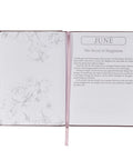 Inside the book is a presentation page that can be inscribed with a date to celebrate a special occasion. 366 devotions that each study Scripture are organized by month. A theme for each month is announced through an introduction page, and a prayer concludes the reading for the month. Subtle gray floral designs decorate the top and bottom of each page