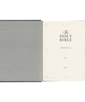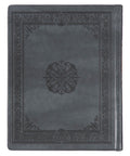 The hardcover Bible is wrapped in iron gray faux leather that is adorned with intricate details and elegant embellishments. The front and back cover features an exquisite heat-debossed interlinked ivy-patterned frame, complemented by delicate corner scroll designs that accentuate the overall design. The title, adorned with gold foil, is displayed on a smooth banner that is superimposed on an elaborate heat-debossed emblem.