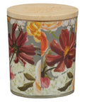 The jar is wrapped in a warm-toned floral design with large, painterly blooms in hues of golden yellow, coral, cream, and soft peach set against a muted charcoal-gray background. Centered on the front is a white label with a hand-lettered gold-foiled sentiment.