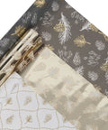 The trio of gift wrap paper rolls are packaged together as a set, and they are designed around a winter botanical theme.