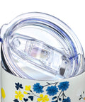 Yellow and blue flowers are scattered across the creamy white surface of the stainless steel tumbler. The gold-foiled sentiment, presented in a multi-font design with lovely flowing scripted letters, is crowned with a gold-foiled bee.