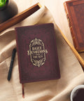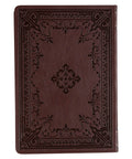 The brown faux leather cover of the daily devotional is heat-debossed with an intricate ancient roman frame that surrounds the gold-foiled title.