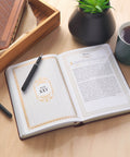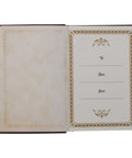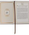 A presentation page in front of the devotional can be personalized. This page is decorated with a gold leaf frame repeated on every devotional page. The interior pages are premium thickness and have a glossy finish, making the gold-foiled accents on each page shimmer and adding an authoritative weight to the book. The devotional is organized by week—52 weeks in total, with 7 devotions per week. Weeks are announced by a full page decorated with gold-foiled roman numerals. The content is organized chronologically and follows the layout of the New Testament. Each entry states the chapter, a theme verse taken from the chapter, and a devotional passage.