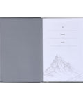 The devotional book's gray faux leather cover is adorned with a heat-debossed border that frames a heat-debossed mountain with a gold-foiled map leading to the peak. The map's gold-foiled trail complements the gold-foiled title.