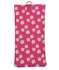 The dual slip pocket eyeglass case perfectly blends two pink floral designs. The larger pocket features a solid pink background accented with light pink blossoms, while the smaller pocket boasts a soft pink backdrop framed by an array of pink and orange flowers, creating a canvas for the black-lettered sentiment.