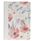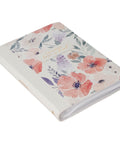 The lovely journal features a pearlized ivory-white faux leather cover that elegantly wraps around the spine and attaches to a screen-printed front panel. This panel is adorned with vibrant purple lilacs and coral poppy flowers. A pearlized ivory-white appliquéd patch on the front cover showcases the copper-foiled sentiment.