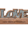 Rustic letters with a galvanized metal effect spell out LOVE. Each letter is framed in wood and grounded on a sturdy wooden base. The letters are accented with 16 small, warm white lights that illuminate the piece. Below the metal letters, the sentiment is expanded in black-scripted letters.