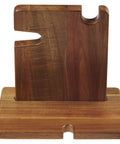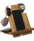 The two-piece organizer easily fits together; just slide the stand into the base. The base has space to store a wallet and includes a groove for threading through a charging cable for charging your electronic devices. The stand features two notches that can hold keys, watches, or personal fitness devices. Lean your phone or tablet against the base for easy charging. There is even space to leave a ring, coins, or pocket knife.