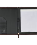 The padfolio boasts a rich walnut brown faux leather exterior complemented by a honey-brown accent panel that stretches horizontally across the front and back covers. This panel is heat-debossed with a typographical design on the front panel. The heat-debossed letters are outlined in gold foil and accented with gold-foiled filigrees.