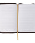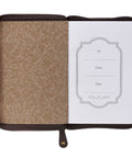 An espresso-brown faux leather tab with a brass metal stud is attached to a brass zipper pull that closes the journal's brown zipper. A brown satin ribbon marker is attached to the spine and will mark your page. Topstitching along the journal's edges and seams produces a sturdy, well-made product.