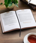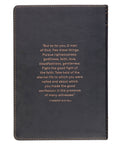 The strong and durable faux leather cover has a two-tone brown design. The backdrop on the front is walnut brown, which is connected to an espresso brown spine and back. A black heat-debossed cross stands tall in the center of the cover design, and copper foiling on the title and subtitle gives the design a polished look.