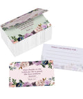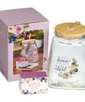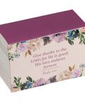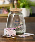 A card pack with 365 cards is included to use to record your notes on gratitude. The cards are decorated with vibrant watercolor floral borders set against pink, peach, green, and lilac purple backgrounds. The front of each card features one of 12 verses that touch on gratitude, while the backs feature several lines superimposed on a watermarked floral design. Use the lined backs of each card to record your thank-you's, prayers, wishes, and hopes, and then store them in the glass jar with its tightfitting silicone rimmed natural wood lid until you are ready to revisit your notes.Refill card packs are available if you want to give each family member a pack of cards, if you need more than 365 cards or if you wish to start afresh. To keep the jar in tip-top shape, we recommend wiping it with a damp cloth when needed. Create a growth mindset in your family by teaching them to record blessings and then revisit the good in your life on a special occasion like Thanksgiving, Christmas, or Easter. Use the Me and My House Purple Floral Glass Gratitude Jar with its beautifully decorated cards to securely hold your blessings.- Clear glass with floral swag design