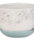 The Mercy White and Light Blue Planter Pot with Saucer is part of the Pastel Meadow Collection, designed to celebrate and testify to God's great mercies. This collection includes a faux leather Bible case, stainless steel water bottle, magnet set, large notebook set, wirebound journal, faux leather journal, ceramic coffee mug, and gift bag.