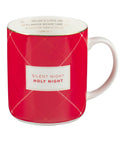 The last mug has a green exterior design with holly branches and red berries. On the front, a square white frame edged in gold foil holds the green-lettered sentiment.