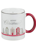 Cozy townhomes adorned with festive wreaths and Christmas trees are arranged at the base of the white ceramic mug. The houses are underlined with a red band with a silver-foiled detail. Above the design, the sentiment is presented in silver-foiled letters.