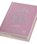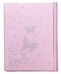 The hardcover journaling Bible for girls is wrapped in metallic pink faux leather. Heat-debossed and silver-foiled hearts and butterflies are scattered across the front and back covers, accenting the title. The title is presented in a large multi-font silver-foiled design and sandwiched between a crown at the top and a heart motif at the bottom.