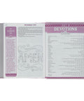 The Bile features two content lists: one lists the books of the Bible in chronological order, and the second lists the books alphabetically. A Bible Memory section includes 66 well-loved Bible verses that every Believer should know and 12 line drawing prayers that will help young girls learn to pray about everything, are ready to be colored and memorized. A line drawing illustration introduces each book of the Bible, and the content that follows is accented with pink banners and highlighted text. 366 devotions, written by Amanda Cowles, are set in the margins and offer inspiring messages to help girls apply biblical truth to their lives. Inspirational stories of 50 memorable women characters in the Bible will motivate girls to pursue a life of faithfully following God.