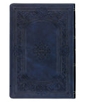 A heat-debossed ivy art nouveau design creates an elegant border around the title of this midnight blue faux leather Bible. The title and version reference on the front, appearing in gold foil, mimic the title and faux ribbing along the spine.