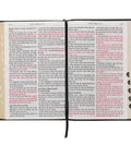 This Bible includes all the essentials you need from a luxury Bible and includes a presentation page at the front, thumb indexing, gilt-edged pages, and a satin ribbon marker. A lay-flat binding lets the Bible open flat on a table without damage to the spine.