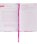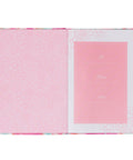 Bright pink gilt-edging adds a luxurious shimmer to the book's design. The interior pages are printed in pink and adorned with floral decorative accents on each page. A pink satin ribbon marker is also included for conveniently marking your spot, helping to prevent the pages from getting dog-eared.