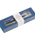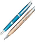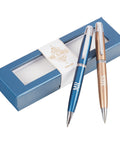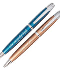 This set of two pens is beautifully packaged in an open faced gift box. These metal ballpoint pens open or close using a turning motion at the top of the pen. A silver clip ensures each pen is securely attached to a book or a pocket. Give this elegant gift set as an anniversary or wedding gift to express your appreciation.