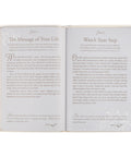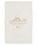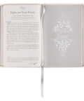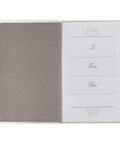 The beautiful pearlized white faux leather cover features a delicate gold foiled floral design and lettering sandwiched between two ornate gold foiled filigree accents.