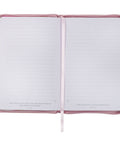 The back cover of the journal is wrapped in pink faux leather that is heat-debossed with a quatrefoil floral design. The pink faux leather wraps around the spine and meets a pearlized white cover on the front. This panel has a subtle sheen and is screen-printed with a chartreuse hummingbird, suspended in the air, preparing to harvest nectar from a watercolored pink bloom. The sentiment is captured below the scene in elegant pink-foiled letters,