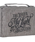 The durable, water-resistant poly-canvas used in constructing the gray Bible case can endure a lot of handling. The front cover is screen printed in black with Scripture taken from the Psalms.
