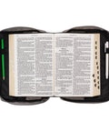 A zipper with a silver cross engraved zipper pull keeps the Bible case securely closed, and a lay-flat handle constructed from the same material as the Bible case folds neatly away so that the Bible can open flat. A slip pocket on the back is handy for storing notes and church bulletins, and two interior pen loops keep a pen and pencil or highlighter at the ready.