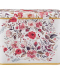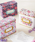 The durable matte tin features a powdery blush pink background printed with a purple and pink watercolor floral pattern. It has a brass interior and edging around the lid and base, and a brass label holder displays a removable label in a beautiful scripted print.