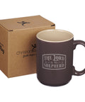 A simple gray arched design frames the gray-lettered sentiment on the front of the mocha-brown ceramic mug.