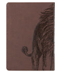 This impressive journal features a majestic heat-debossed lion that stretches across both the front and back covers. The design's attention to detail is phenomenal. It is set on a background of dark brown faux leather that has a vintage feel. The lion is not seeking to attack or devour, but rather, it stands calm and resolute with the power of a king. The sentiment is heat-debossed below the image on the front cover.