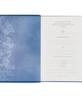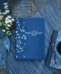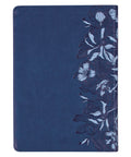 The spine of the navy blue faux leather Bible is embellished with a heat-debossed outline of a creeping clematis. Light blue accents are added to the petals to create depth. The title is presented in clear silver-foiled letters.