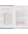 The flexible cover of the Bible opens flat to reveal the complete text of the NLT (New Living Translation). Luxury design features of this Bible include a presentation page, gilt-edged pages, ribbon markers, a thumb index, and an index of authors and articles in the back. In addition, the presentation page in the front can be personalized and states the premise for the design of this beautiful Bible.