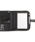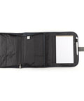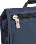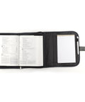 The serious student in you will love the Navy Polyester Trifold Organizer Bible Cover with Engraved Ichthus Badge. It is designed for those among us who like to have study tools all in one place.The sturdy polyester cover is woven in a checked design with a decorative silver metal badge engraved with the Ichthus fish accent and cross engraved silver zipper-pulls. A convenient lay-flat handle ensures that the organizer opens flat, and a strap with snap buttons keep all the panels closed. A zippered exterior pocket cane found on the back panel of the closed cover. The organizer has 3 compartments: one for a notebook, one for your Bible, and another for your study tools. The Bible compartment can be zipped closed inside the cover. The study tools compartment include an ID/photo and 3 credit card slots, a cell phone pocket, a zipped mesh pocket, and two pen loops. The notepad compartment includes a notepad and highlighter in a third pen loop. This Bible cover is available in two sizes: medium and large. Please refer to the last image in the image carousel on the left for the Bible Cover Sizing Chart before you make a selection.If you know someone who likes to have their space organized and their tools at their fingertips before they start their daily quiet time, then you cannot go wrong by giving them this Navy Polyester Trifold Organizer Bible Cover with Engraved Ichthus Badge.