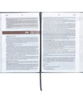 Inside the devotional Bible, you'll notice the striking two-color text, printed in black and brown and presented in a single-column layout. This Bible's lay-flat binding is Smyth-sewn, ensuring that you can easily read every word, which is printed in clear 10-point type. It even includes a ribbon marker for tracking your progress as you read. The front of the Bible features a presentation page that can be personalized to celebrate a special birthday or milestone event.