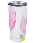 Watercolor citrus leaves in yellow and pink pastels float across the white background of the stainless steel mug. The sentiment is gilded in rose gold across the leaves.