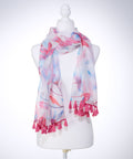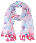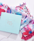 Purple and blue watercolor petals spring up around the white background of this lightweight sheer scarf with its pink tassel trim. The scarf arrives tucked in a light teal gift box with the same full-color printed floral pattern adorning the inside of the box. The lid displays the scarf's sentiment in a rose gold-foiled frame and letters.