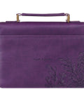 A purple faux leather slip pocket on the back panel is heat-debossed with a large cosmos flower arrangement that adjoins the heat-debossed Scripture verse.