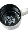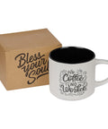 Featuring a sleek black and white color scheme, this ceramic mug is an excellent gift for anyone who loves coffee! Black cursive lettering framed by curving lines pops out against the white background. The interior is black to match the Bless Your Soul imprint of this product line at the bottom of the mug. Our No Coffee No Worke Ceramic Coffee Mug caters to any and all coffee addicts with its neutral design and relatable message!