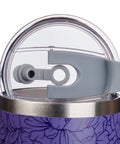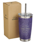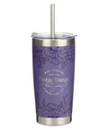 The deep lavender purple powder-coated exterior of the stainless steel tumbler is decorated with tone-on-tone dark purple flower outlines at the top and bottom. In the center, the silver laser-engraved sentiment is presented in a typographical design.