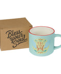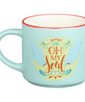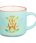 The delicate light aqua exterior of the ceramic mug is contrasted with a red rim. The sentiment is presented in a maroon red font against a light yellow background. Gossamer blue wings sandwich the sentiment and remind you to let your soul soar throughout the day. The interior of the Oh My Soul Ceramic Coffee Mug is white, with the Bless Your Soul imprint featured on the bottom for extra encouragement. My oh my, every soul out there needs to grab one of these!