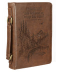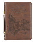 The rugged wilderness scene depicted on the On Wings Like Eagles Brown Faux Leather Classic Bible Cover sets a visually and spiritually peaceful tone. It is a reminder that trusting in the LORD gives strength and renews the spirit. As spending time in the great outdoors renews the mind and body, so our hearts are renewed when we spend time with the LORD, and this handsome Bible cover will protect your Bible no matter where your travels take you.