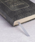 The graphite gray cover has an ornate heat-debossed floral damask design. A gold, beveled frame borders the title, which is also gold-foiled. A small graduation cap sits above the title, adding to the graduation theme of this gift book. Gold gilt-edged pages and a silver ribbon marker finish off the elegant look.