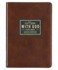 The One Minute with God for Men Daily Devotional is designed to help men connect with God in bite-sized moments throughout their day.The saddle tan faux leather cover of the devotional is decorated with a black appliquéd patch. The patch is framed with a gold foiled border and holds the gold foiled title in large, easy-to-read letters.